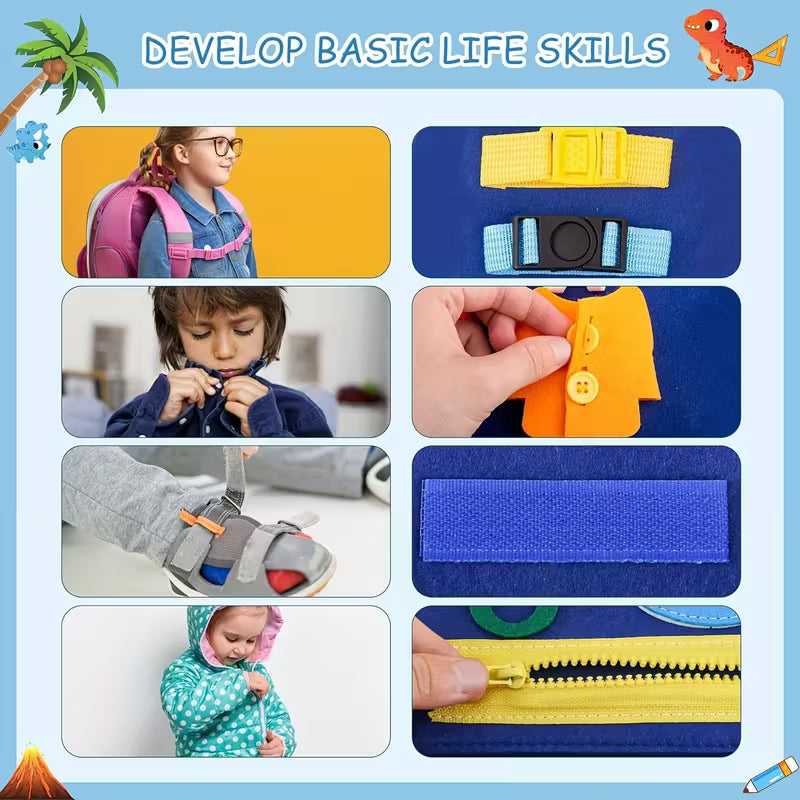 Featuring buttons, zippers, buckles, switches, and laces, this all-in-one activity board offers a fun and interactive way for toddlers to explore textures and practice essential life skills. Its lightweight and portable design makes it a perfect travel toy for car rides, airplane trips, or quiet playtime at home.